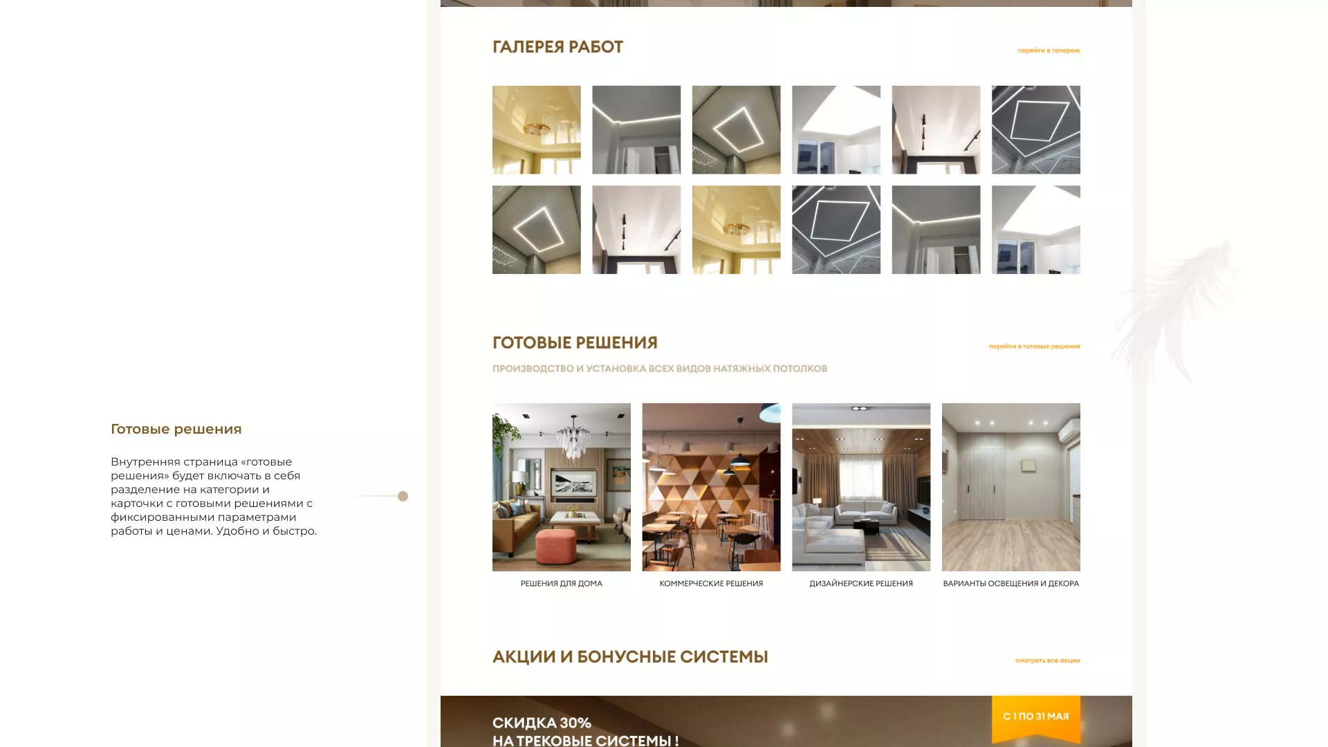 Что мы сделали. Разработали сайт в теплых и уютных «шоколадных» тонах. Продумали структуру, наполнили ее удобными разделами такими как «готовые решения», которые включают в себя не только уже готовые варианты с фиксированной ценой, но и разделение по категориям: решения для дома, коммерческих помещений, интересные дизайнерские решения. Так же предложили клиенту онлайн-калькулятор, что может существенно упростить потенциальным заказчикам нашего клиента в Комсомольске заказ потолков.